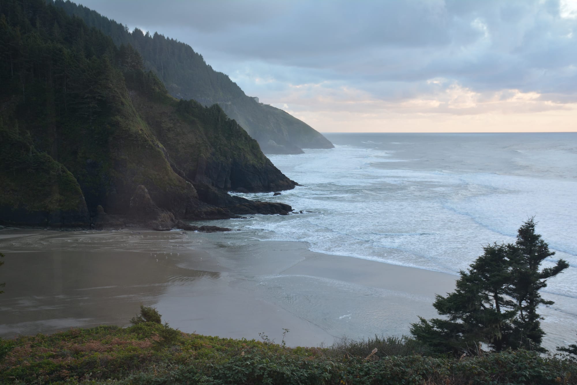 After a couple of long switchbacks, I stood on an almost deserted beach. The clouds may have obscured my sunset photo, but the light illuminating them and reflecting off the beach and water made the trip worthwhile. I may never get to hike the rest of the 382-mile Oregon Coast Trail, but this short visit was a perfect glimpse into the beauty and the ruggedness of the trail.